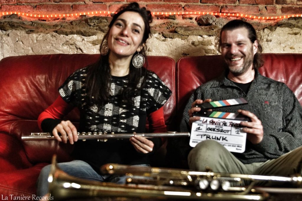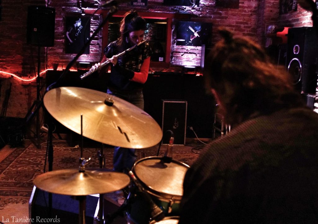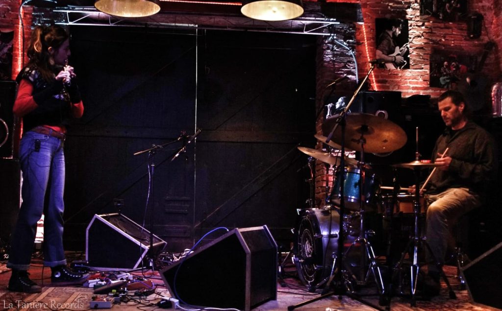 Aymeric Avice and Delphine Joussein in an unprecedented battle: the flow is provided by a trumpet, a flute, a horn, 37 effects pedals, and… A BIG DRUM KIT!